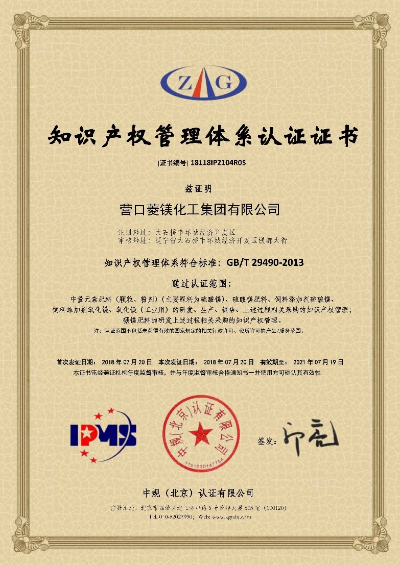 集團公司是國家高新技術企業,在致力于鎂肥料、鎂飼料添加劑及含鎂功能性材料產品創新研發的同時,高度重視知識產權工作,目前已申請專利21項,獲得授權專利9項,其中發明專利2項,實用新型專利7項;擁有注冊商標2項;主持起草完成國家標準2項。